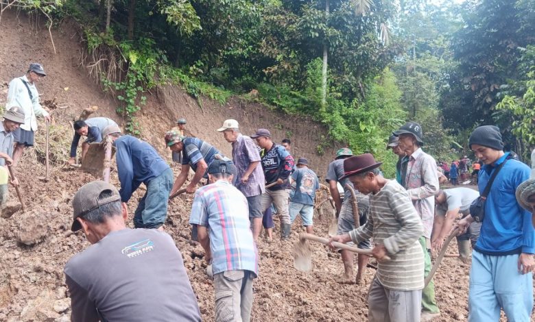 Material longsor diangkut perlahan. Tanah dimasukkan ke karung. Bebatuan digeser. Tidak ada alat berat, tidak ada helm proyek. Yang ada hanya tekad dan ketahanan khas kampung.